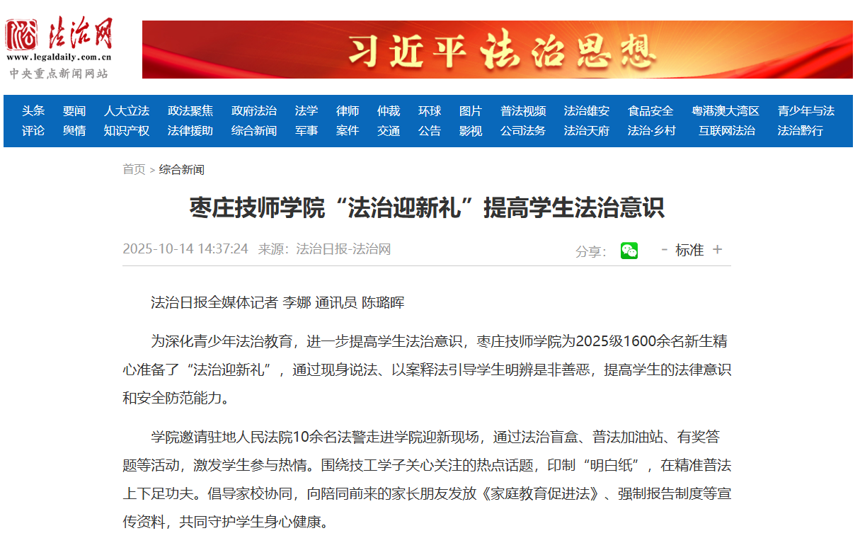 10月14日,《法治日报》刊发《枣庄技师学院“法治迎新礼”提高学生法治意识》文章,宣传推介我院坚持依法治校推进法治校园建设典型做法。文章指出,为深化青少年法治教育,进一步提高学生法治意识,枣庄技师学院为2025级1600余名新生精心准备了“法治迎新礼”,通过现...